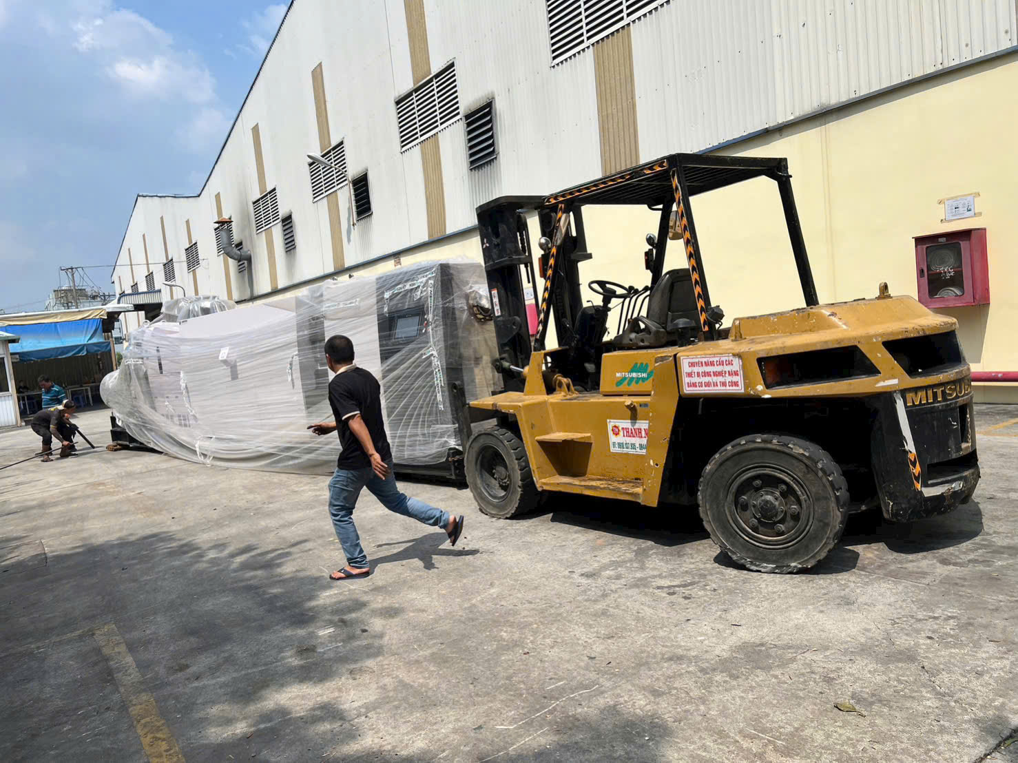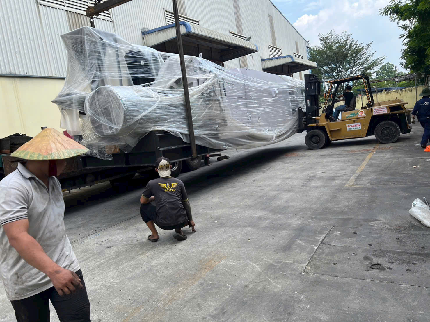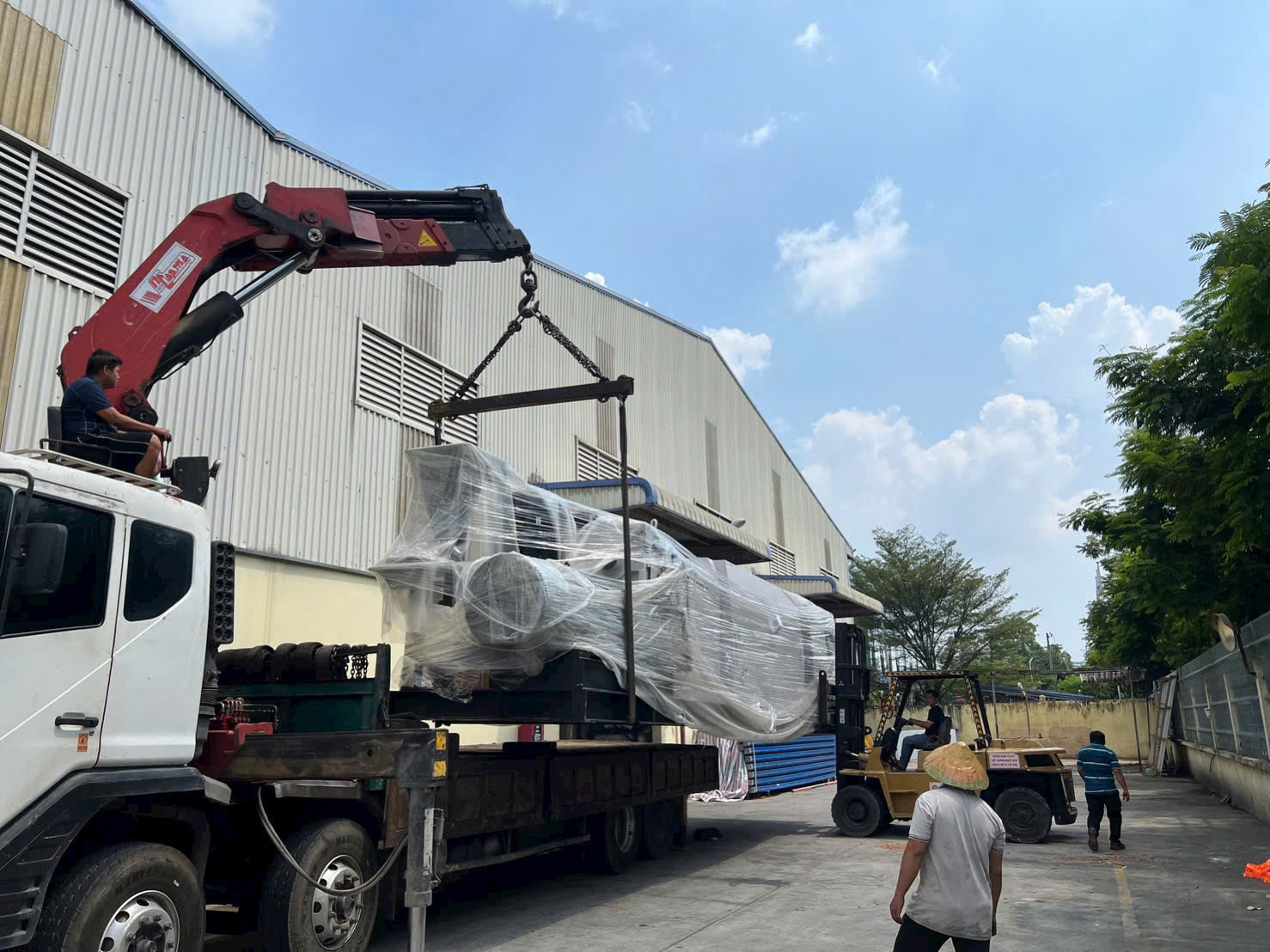 Xe cẩu và xe nâng Thanh Nhã hỗ trợ xuống máy cho khách hàng