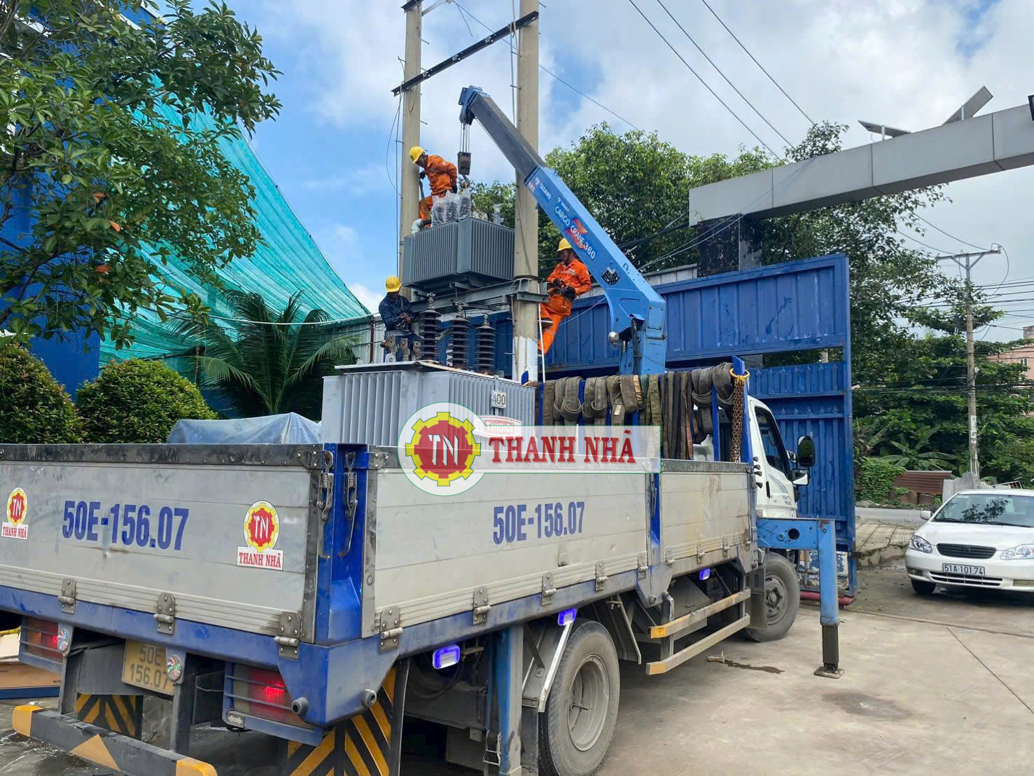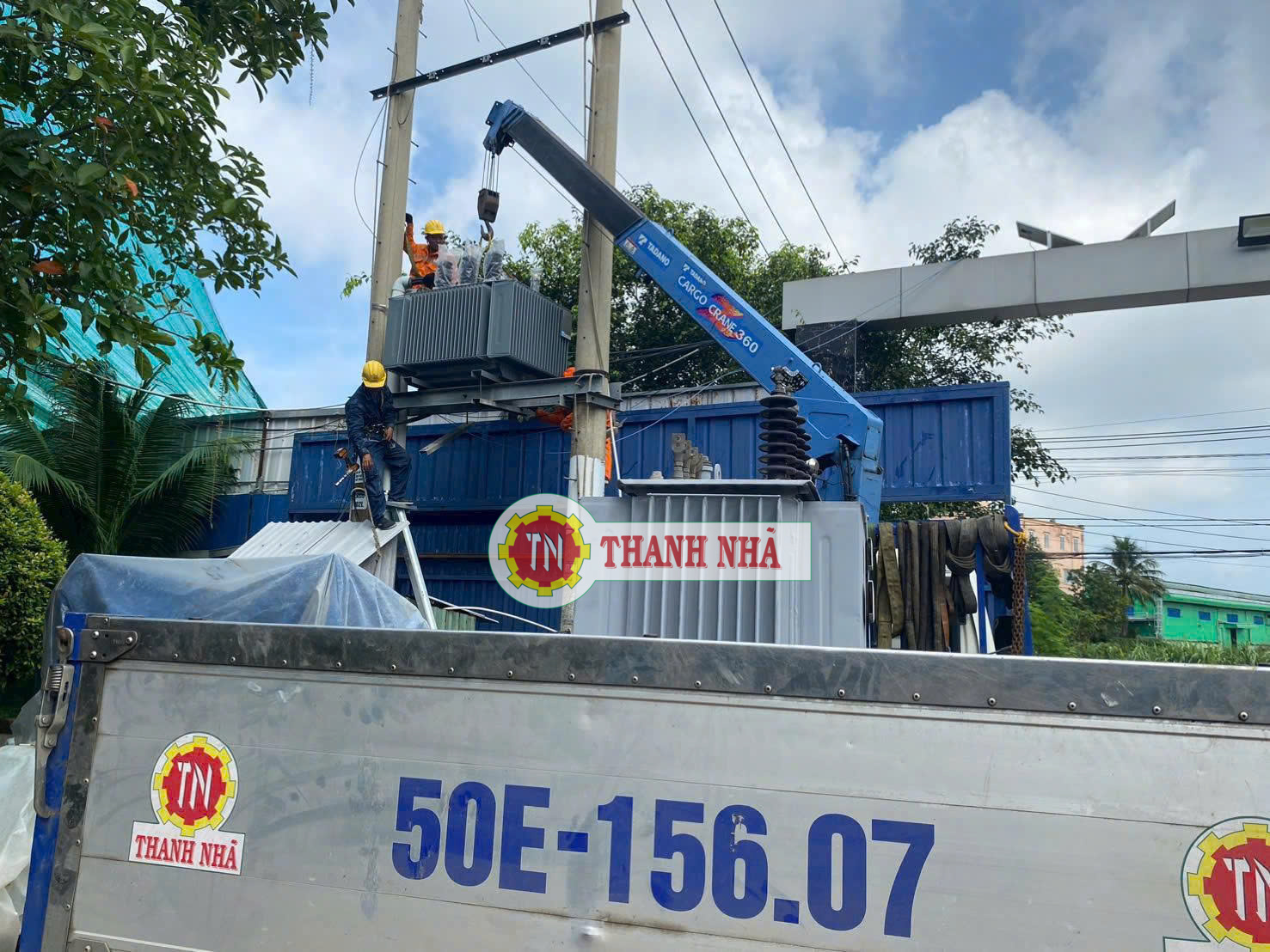 Xe cẩu Thanh Nhã hỗ trợ anh em điện lực lắp đặt máy biến áp