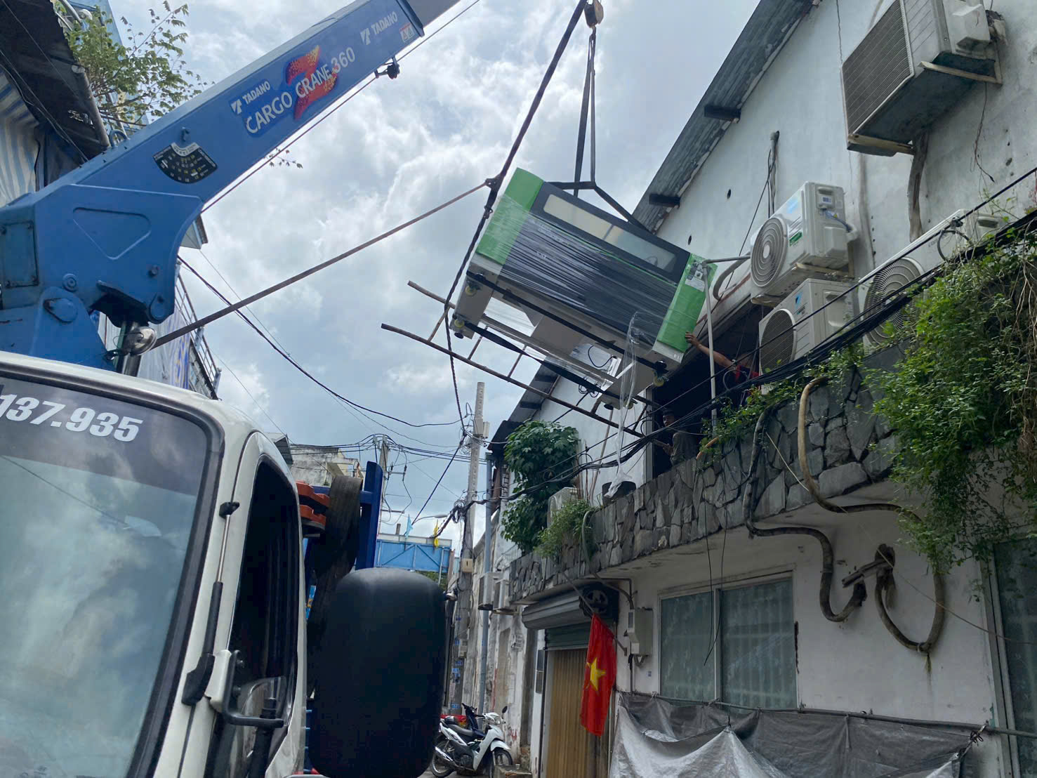 Xe cẩu tiến hành cẩu hàng vào vị trí chật hẹp cho khách