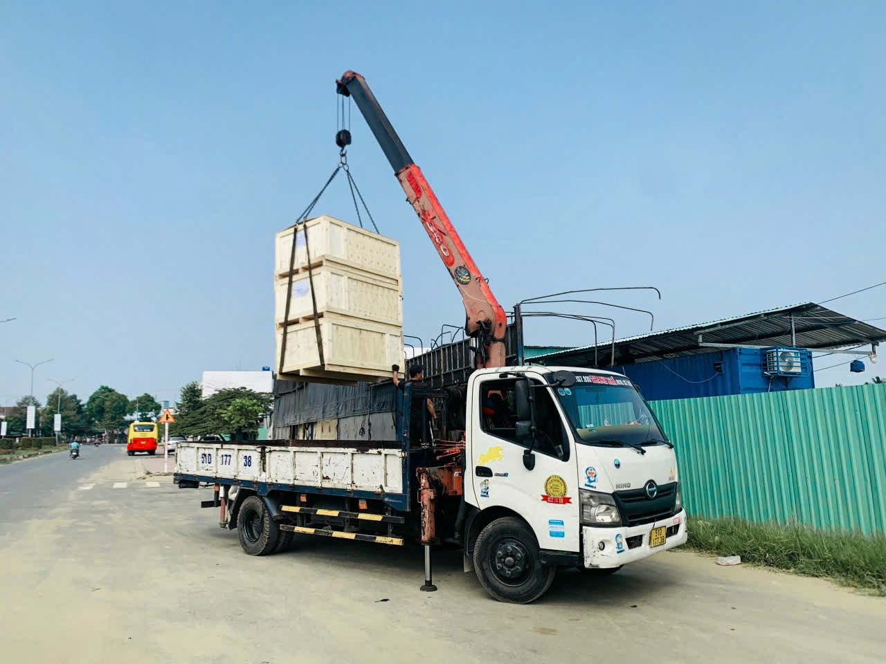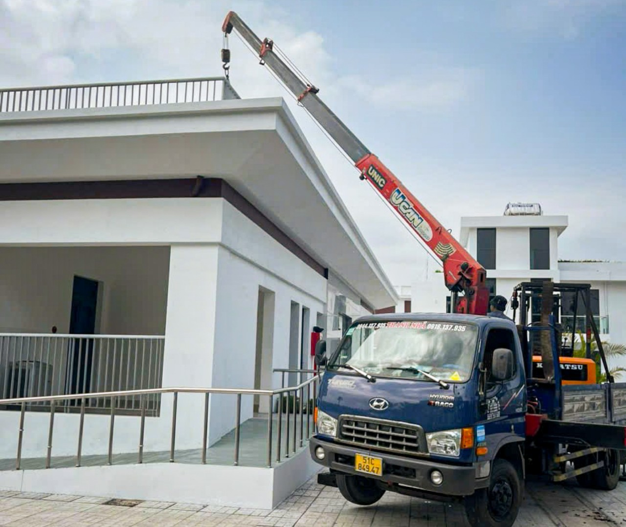 Hình ảnh xe cẩu đang nhấc hàng giao khách