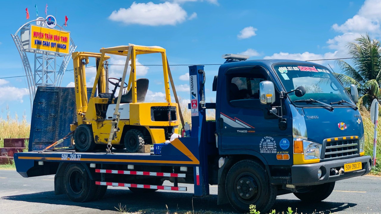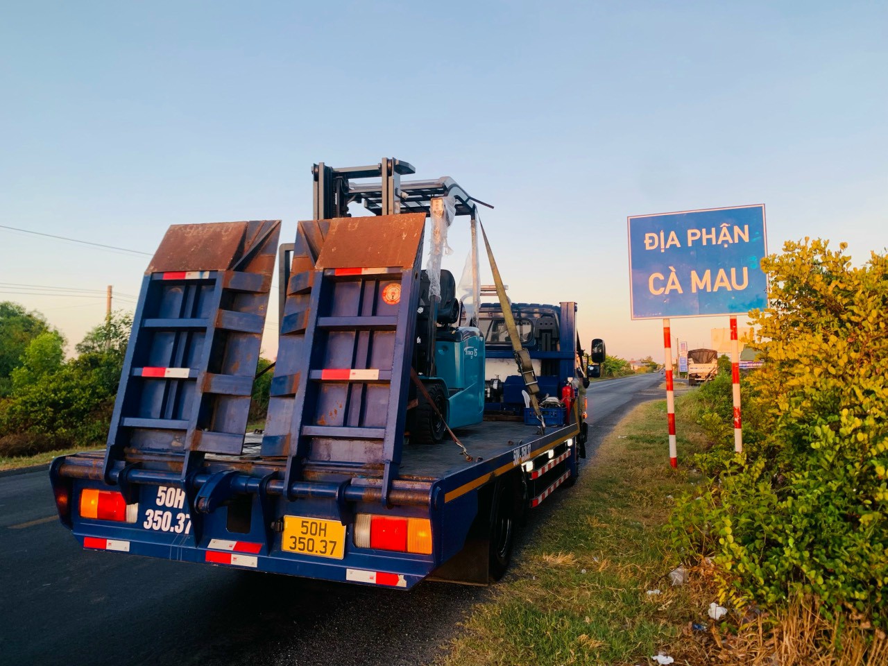 Hình ảnh xe cẩu đang vận chuyển xe nâng giao khách Cà Mau