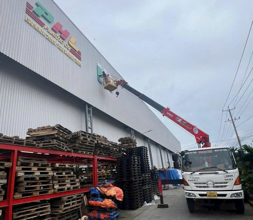 Xe cẩu Thanh Nhã đang hỗ trợ lắp đặt biển hiệu