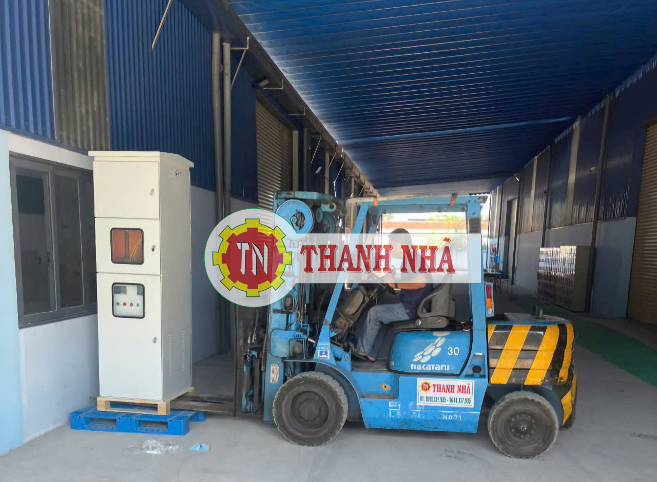 Hình ảnh xe nâng vận chuyển tủ lưu điện tại kho khách hàng