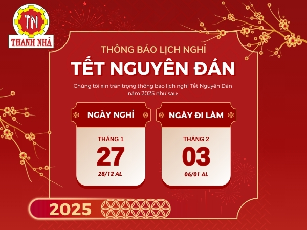 Nhân dịp Tết Nguyên Đán 2025, Công ty Nâng Cẩu Thanh Nhã xin trân trọng thông báo về lịch nghỉ Tết như sau: