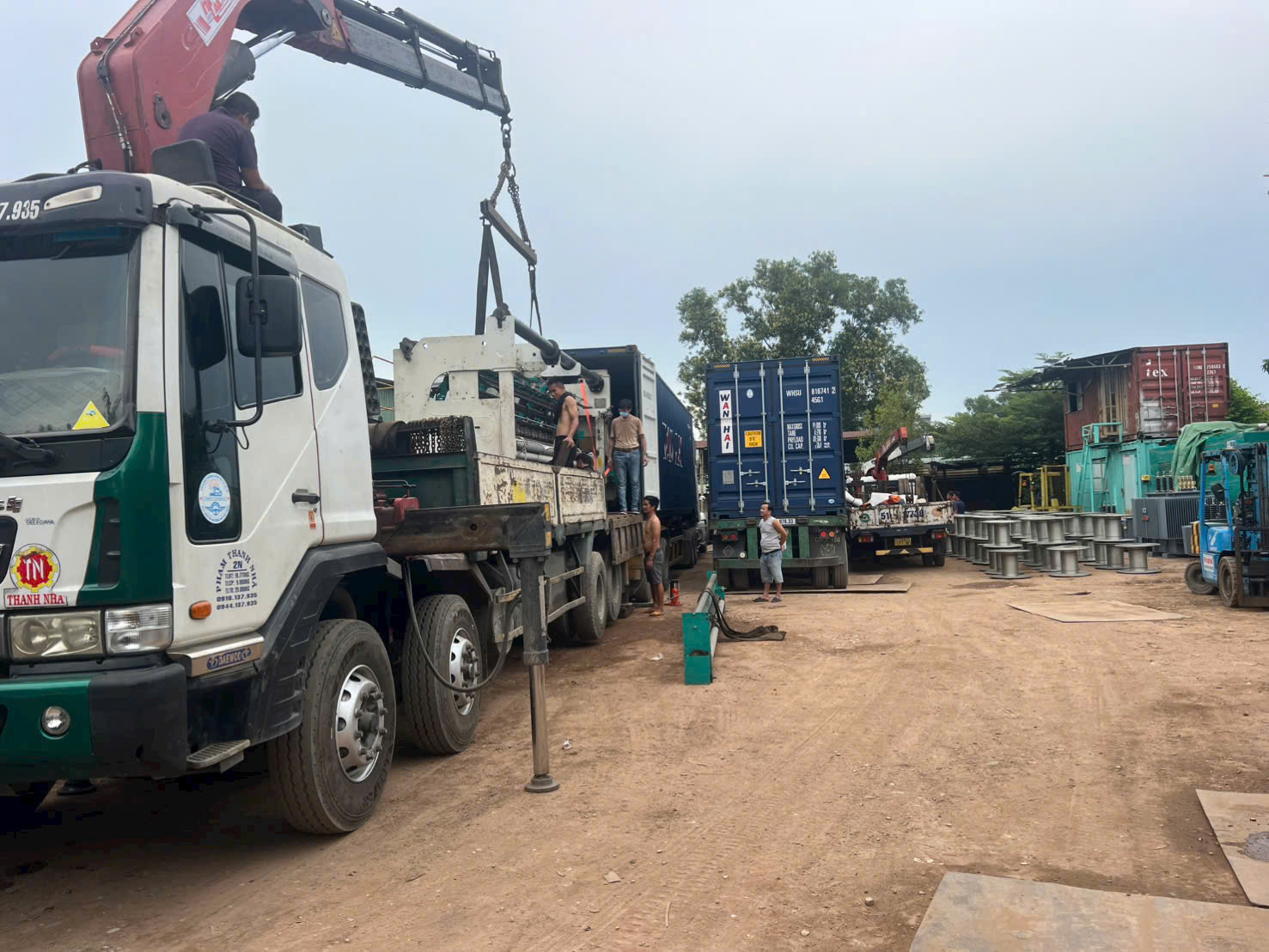 Hình ảnh xe cẩu Thanh Nhã đang bốc xếp những kiện hàng ở kho bãi
